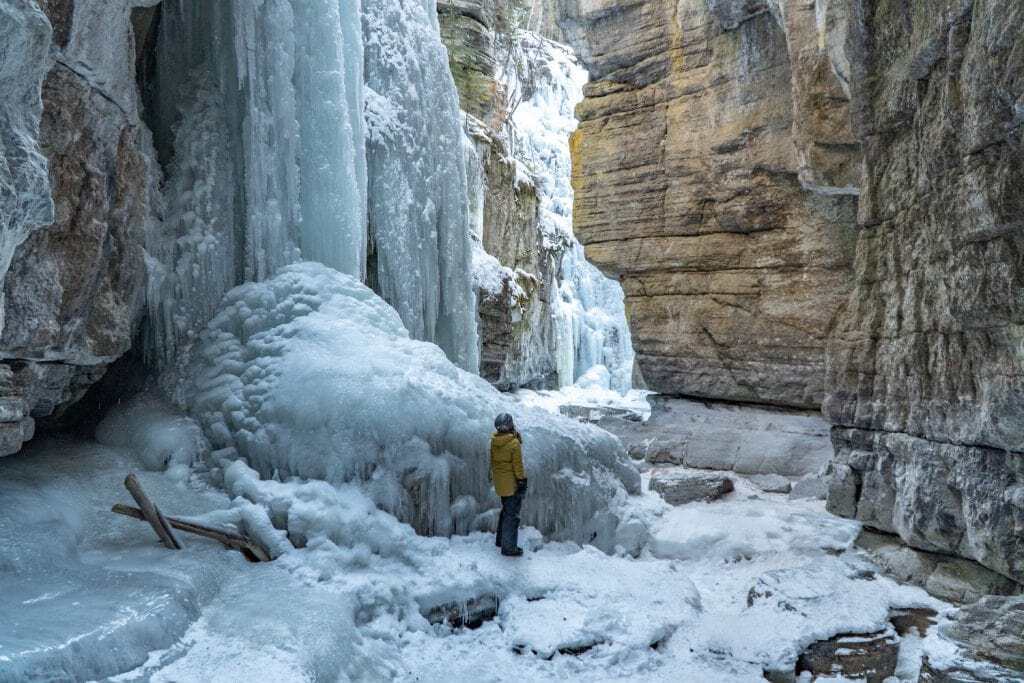 Admiring the frozen waterfalls of Maligne Canyon, AB.