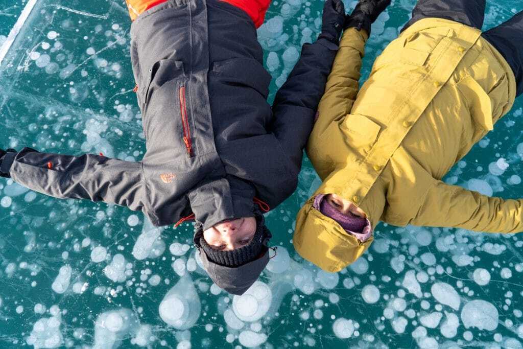 Enjoying the ice bubbles in Abraham Lake, Alberta.
